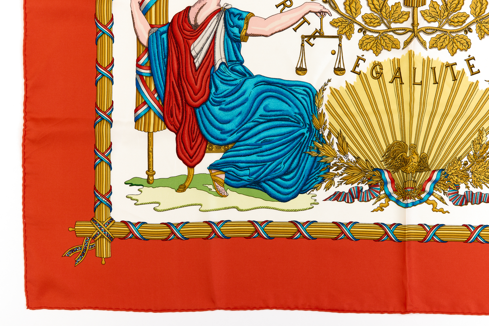 Hermes Silk Scarf Carre 90 “LIBERTE EGALITE FRATERNITE REPUBLIQUE FRANCAISE” Orange Silk Scarf Brand : HERMESDesign by Joachim Metz Issued 1989Item : ScarfSize : 88.5cm * 88.5cmMaterial : 100% SilkCondition Score: B+*For reference. The condition shown in the image takes precedence.*Please see the last two photos to see if the tag is still attached