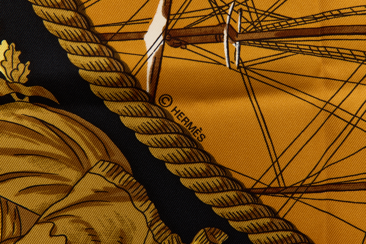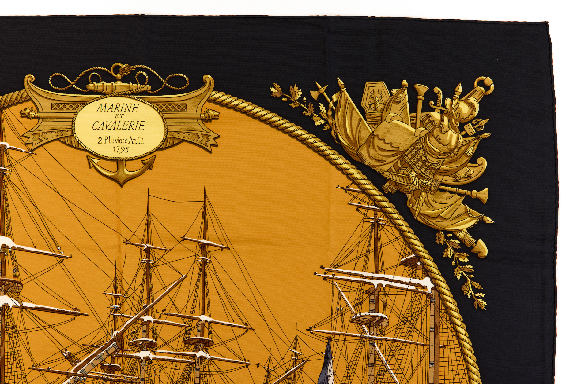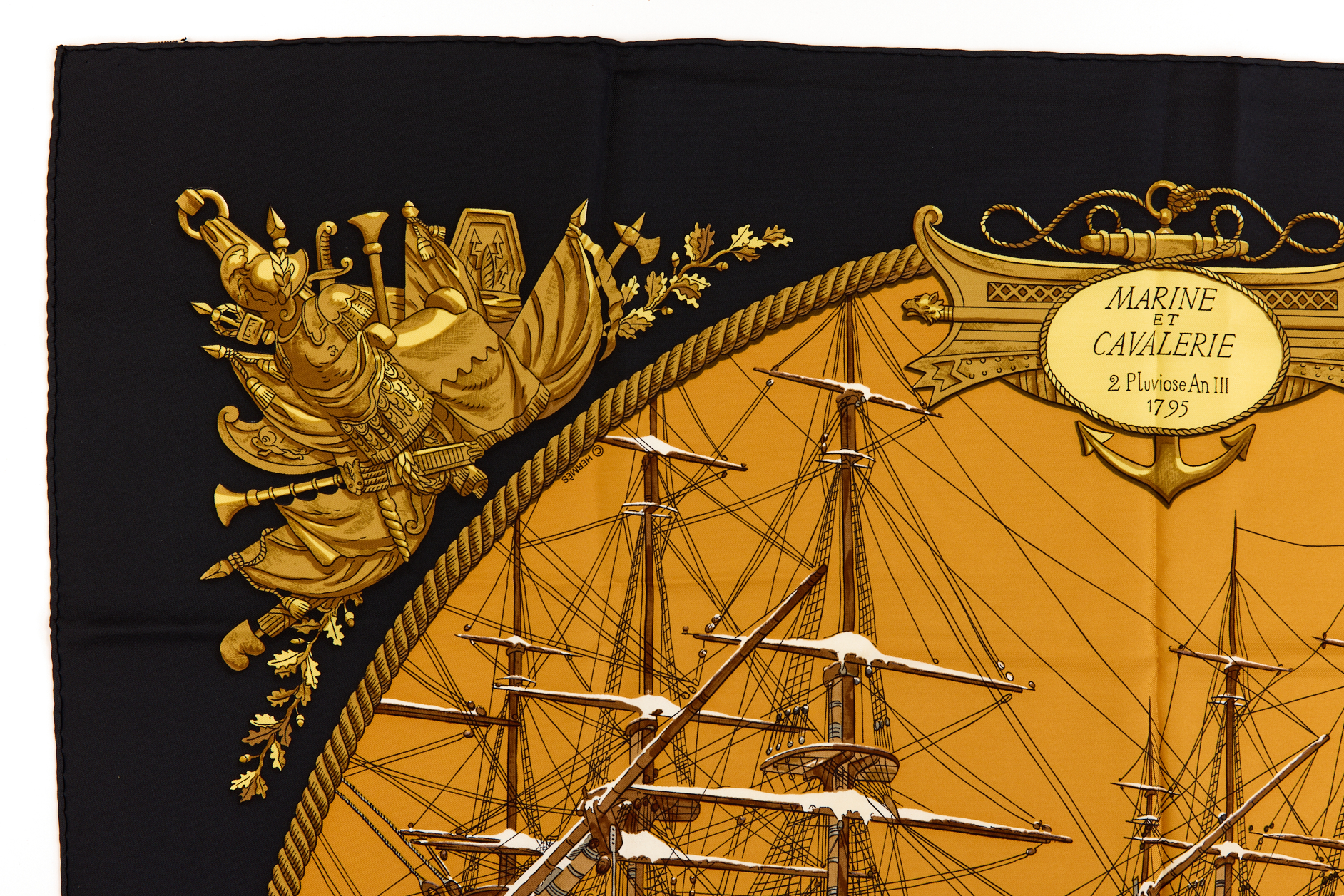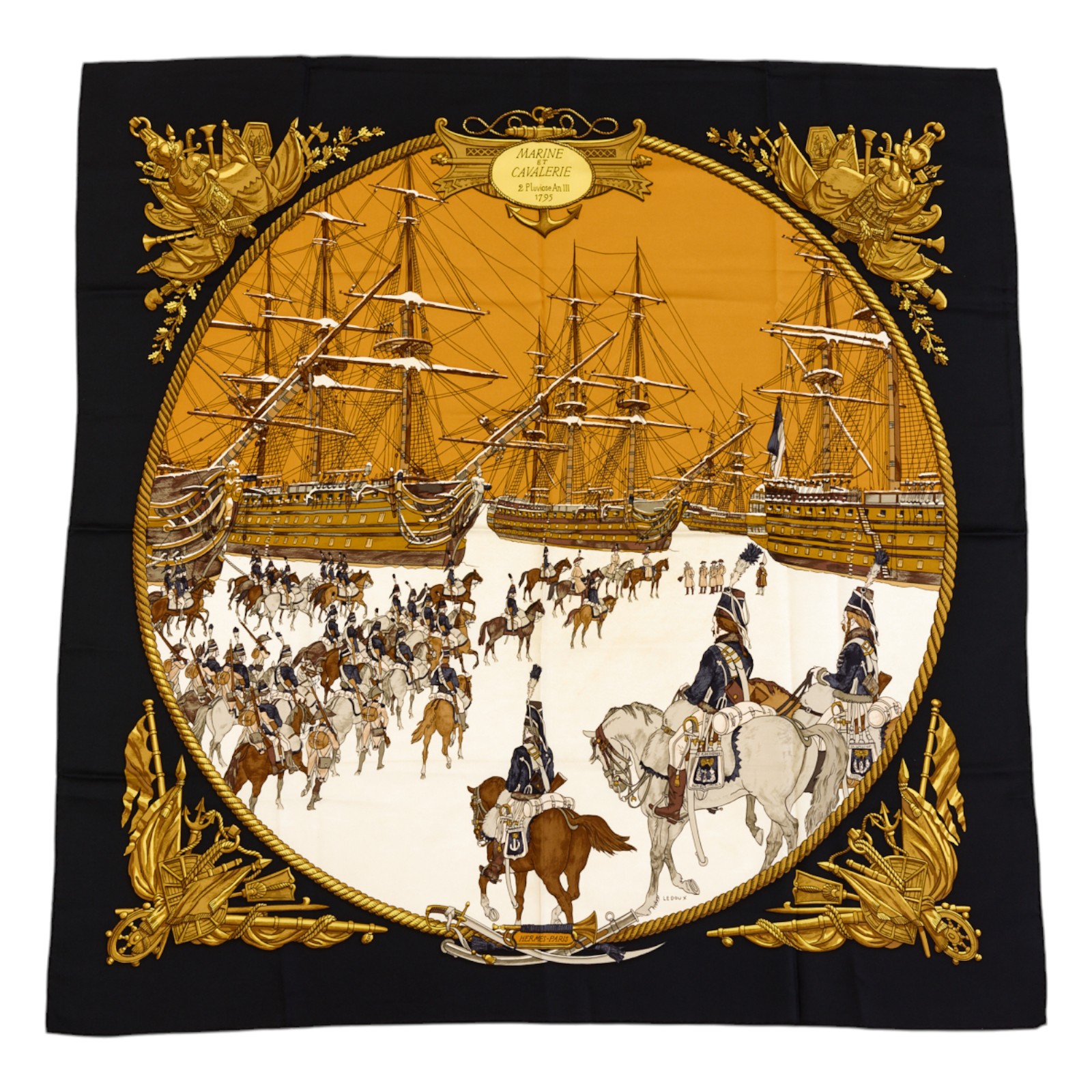 Hermes Silk Scarf Carre 90 “Marine et Cavalerie” Black Silk Scarf Brand : HERMESDesign by Philippe Ledoux Issued 1967Item : ScarfSize : 88.5cm * 88.5cmMaterial : 100% SilkCondition Score: B+*For reference. The condition shown in the image takes precedence.*Please see the last two photos to see if the tag is still attached