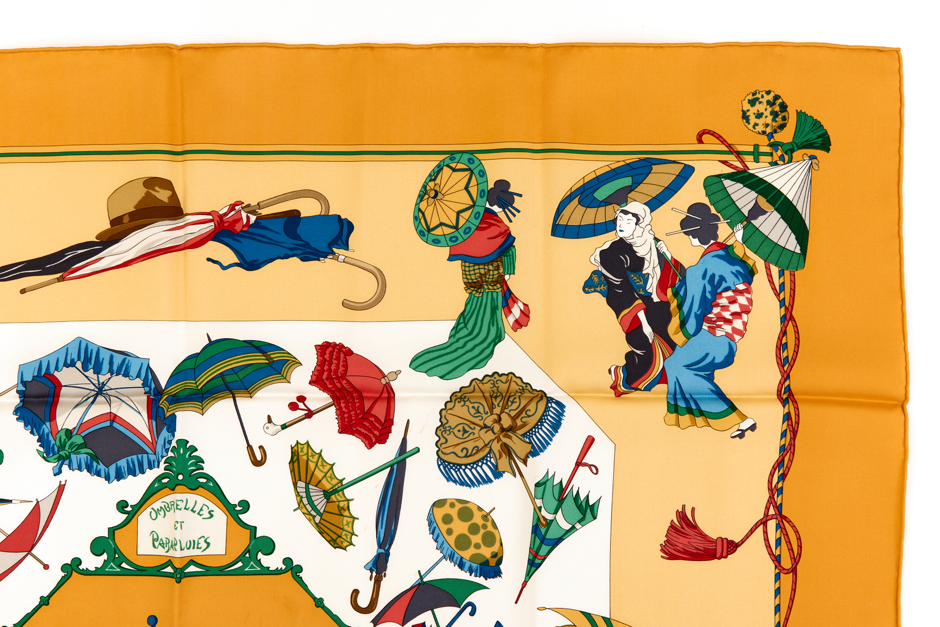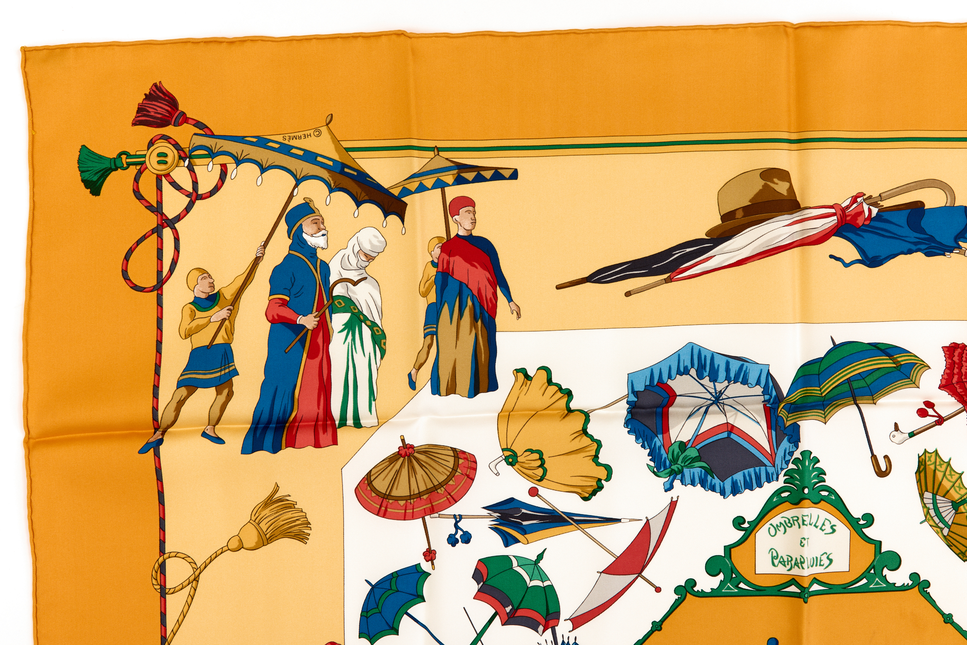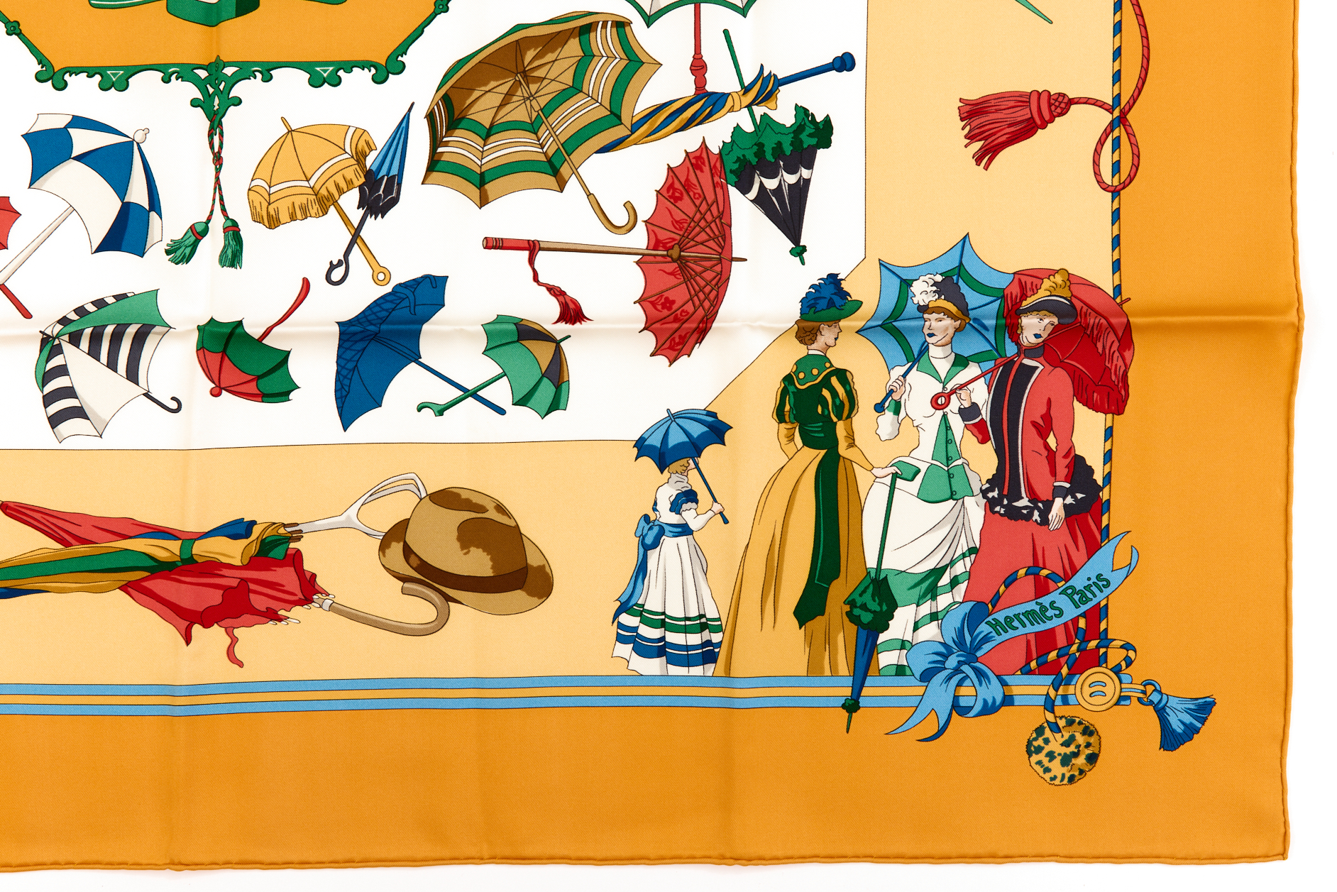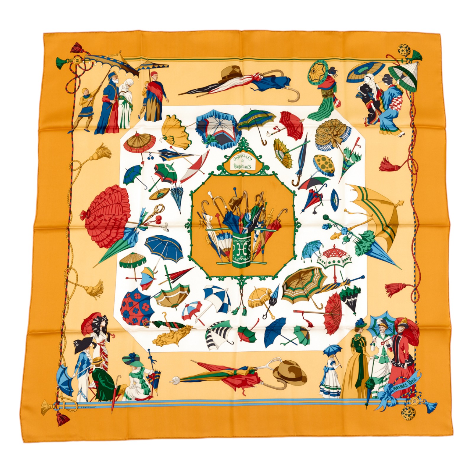 Hermes Silk Scarf Carre 90 “Ombrelles et Parapluies” Orange Silk Scarf