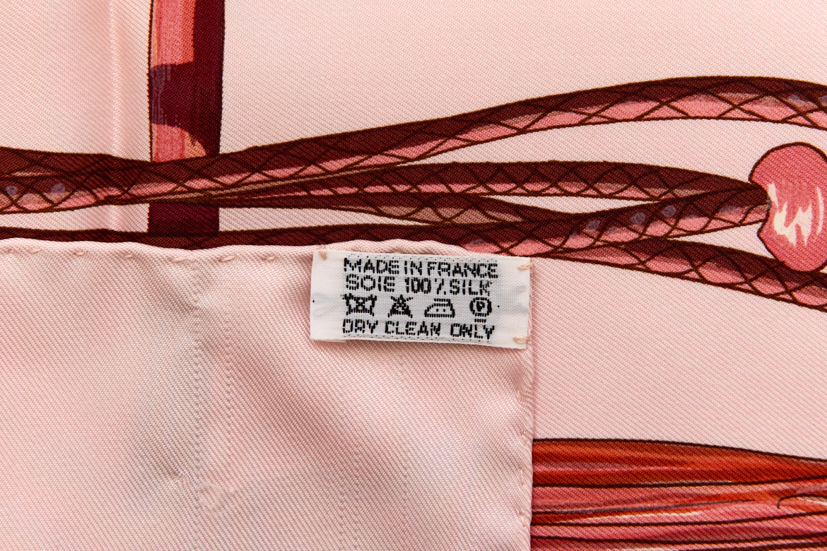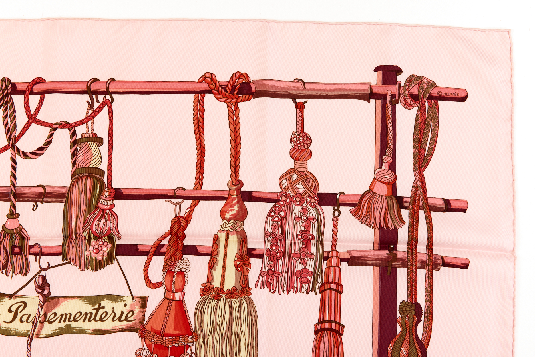 Hermes Silk Scarf Carre 90 “Pasementerie” Pink Silk Scarf Brand : HERMESDesign by Franoise Heron Issued 1960Item : ScarfSize : 88.5cm * 88.5cmMaterial : 100% SilkCondition Score: B+*For reference. The condition shown in the image takes precedence.*Please see the last two photos to see if the tag is still attached