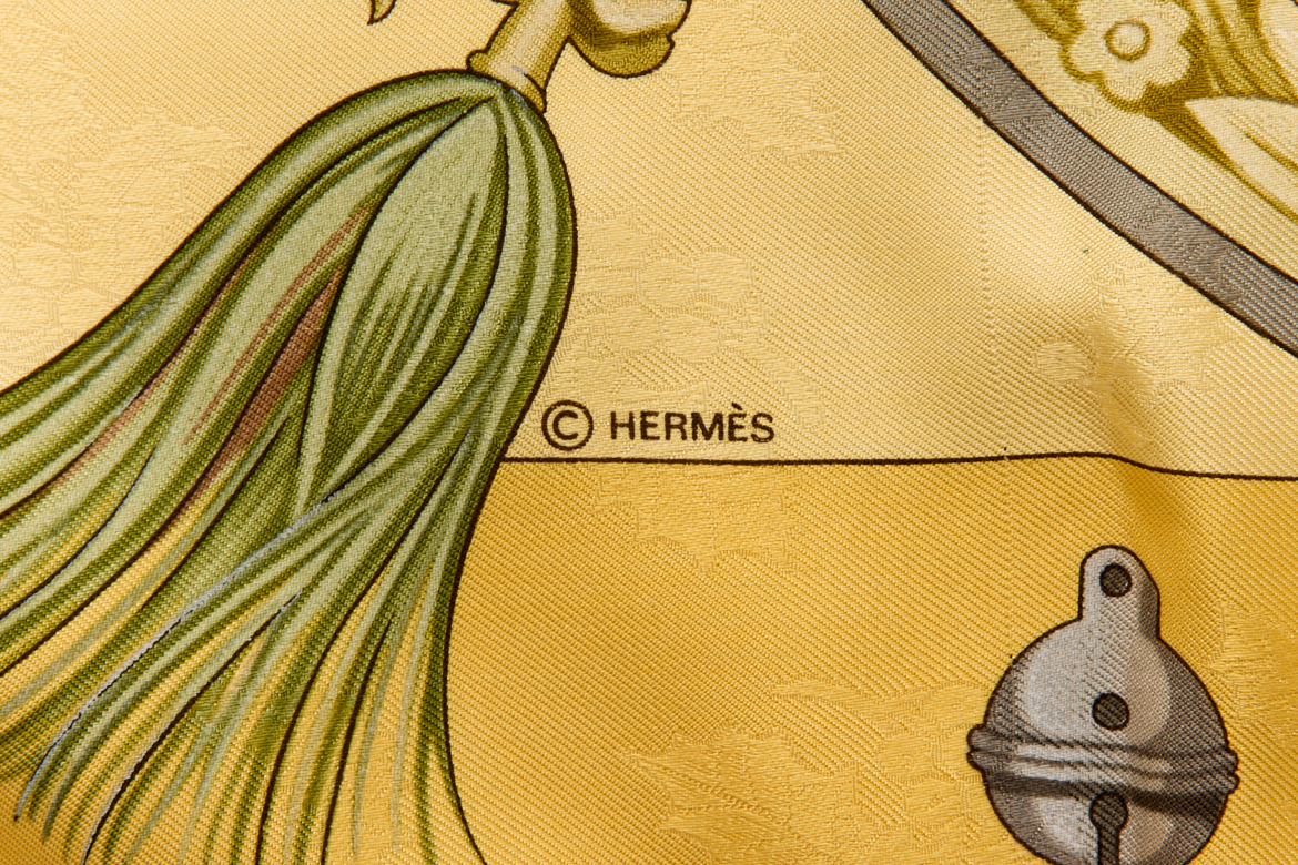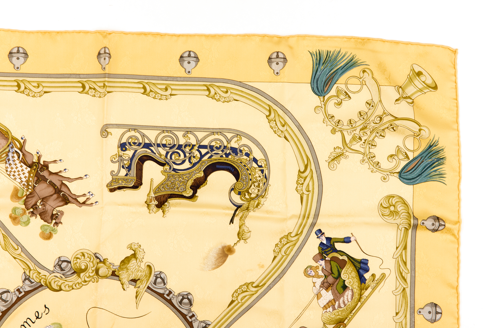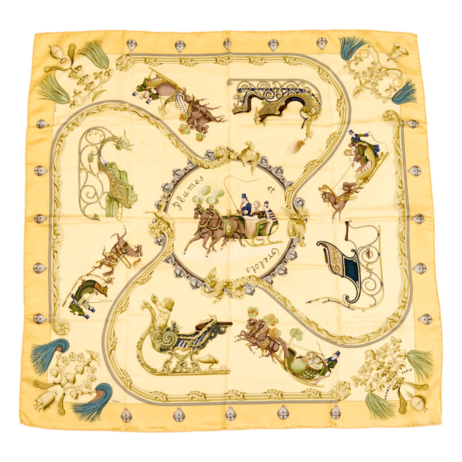 Hermes Silk Scarf Carre 90 “PLUMES ET GRELOTS” Yellow Silk Scarf