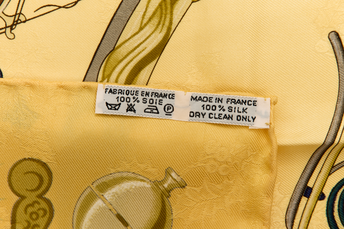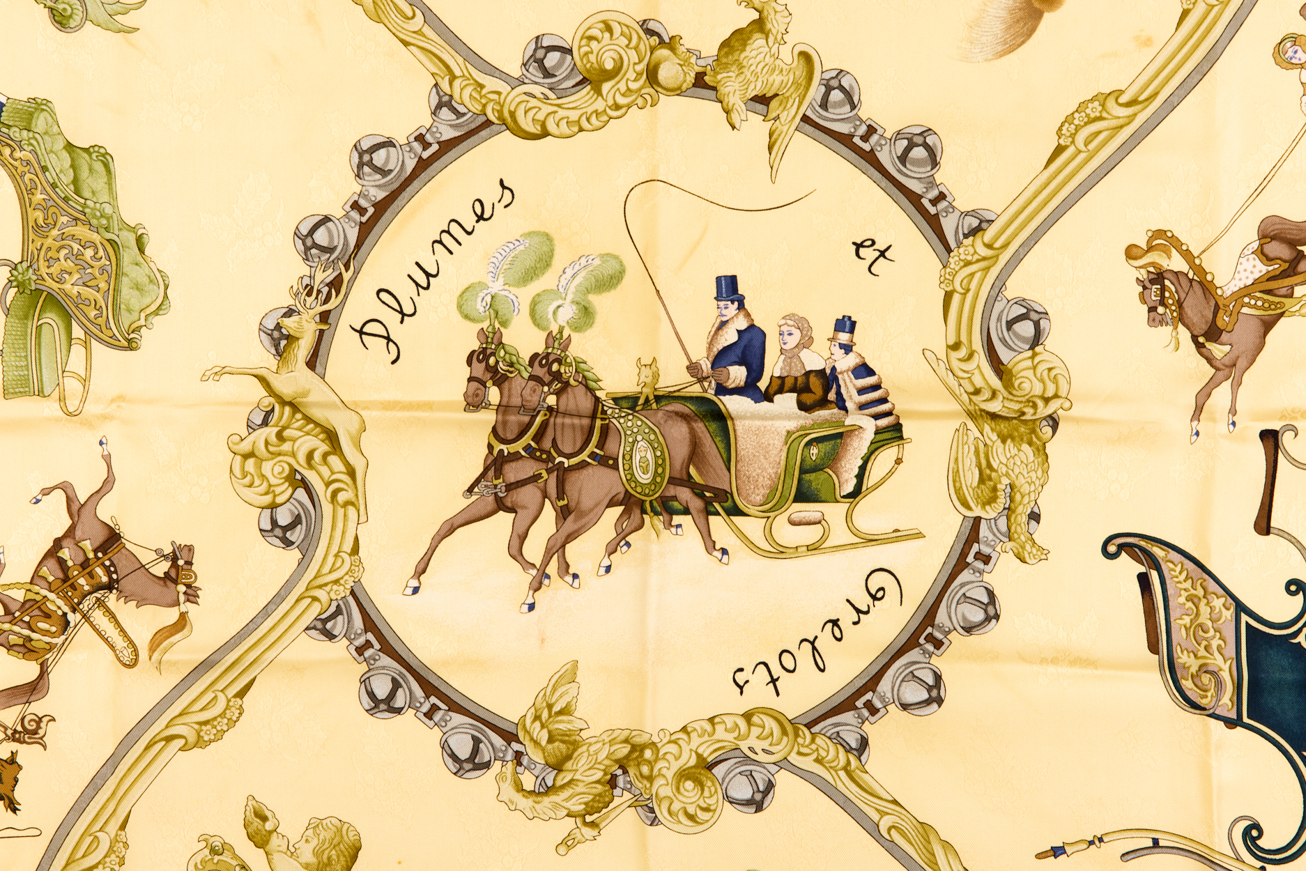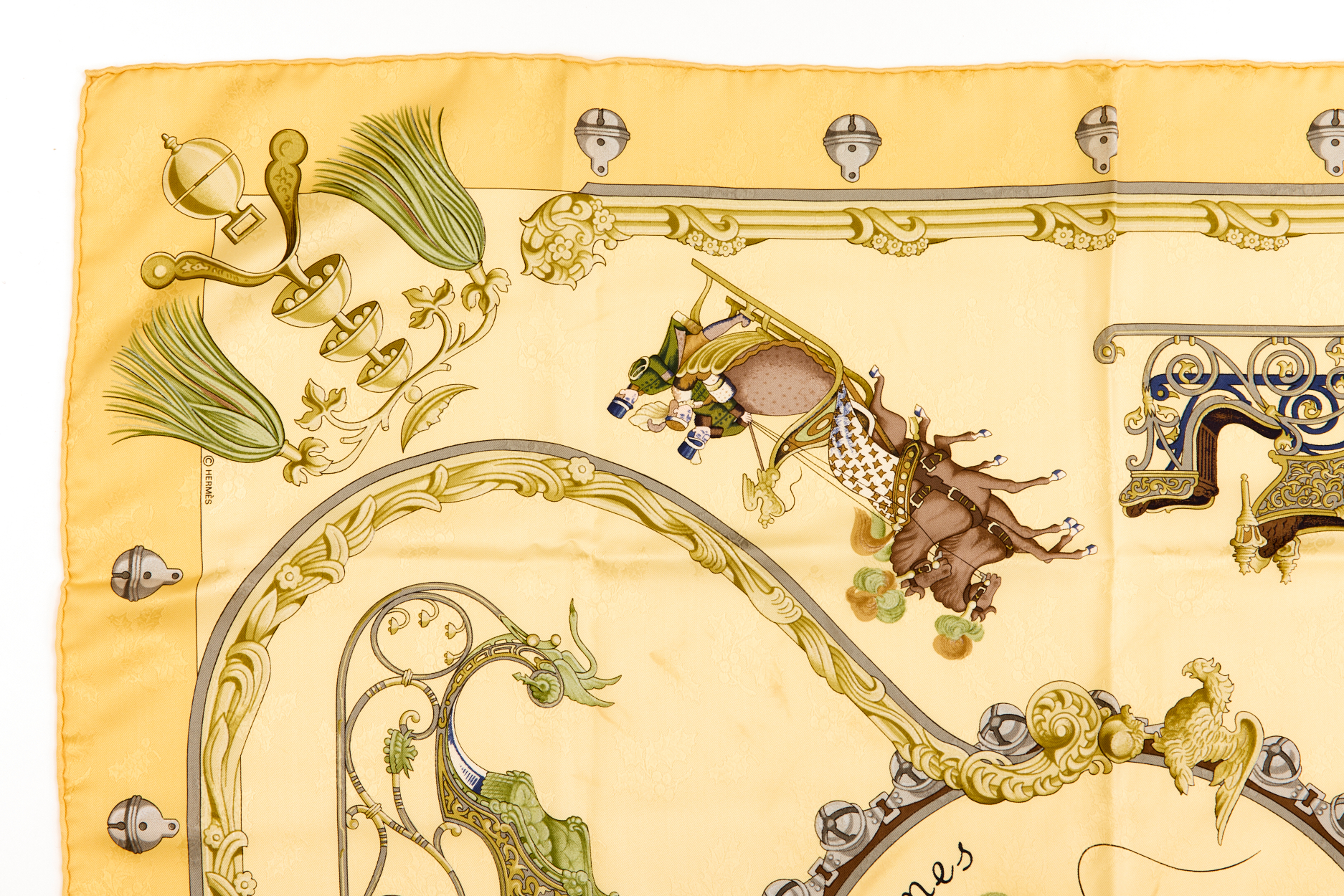 Hermes Silk Scarf Carre 90 “PLUMES ET GRELOTS” Yellow Silk Scarf