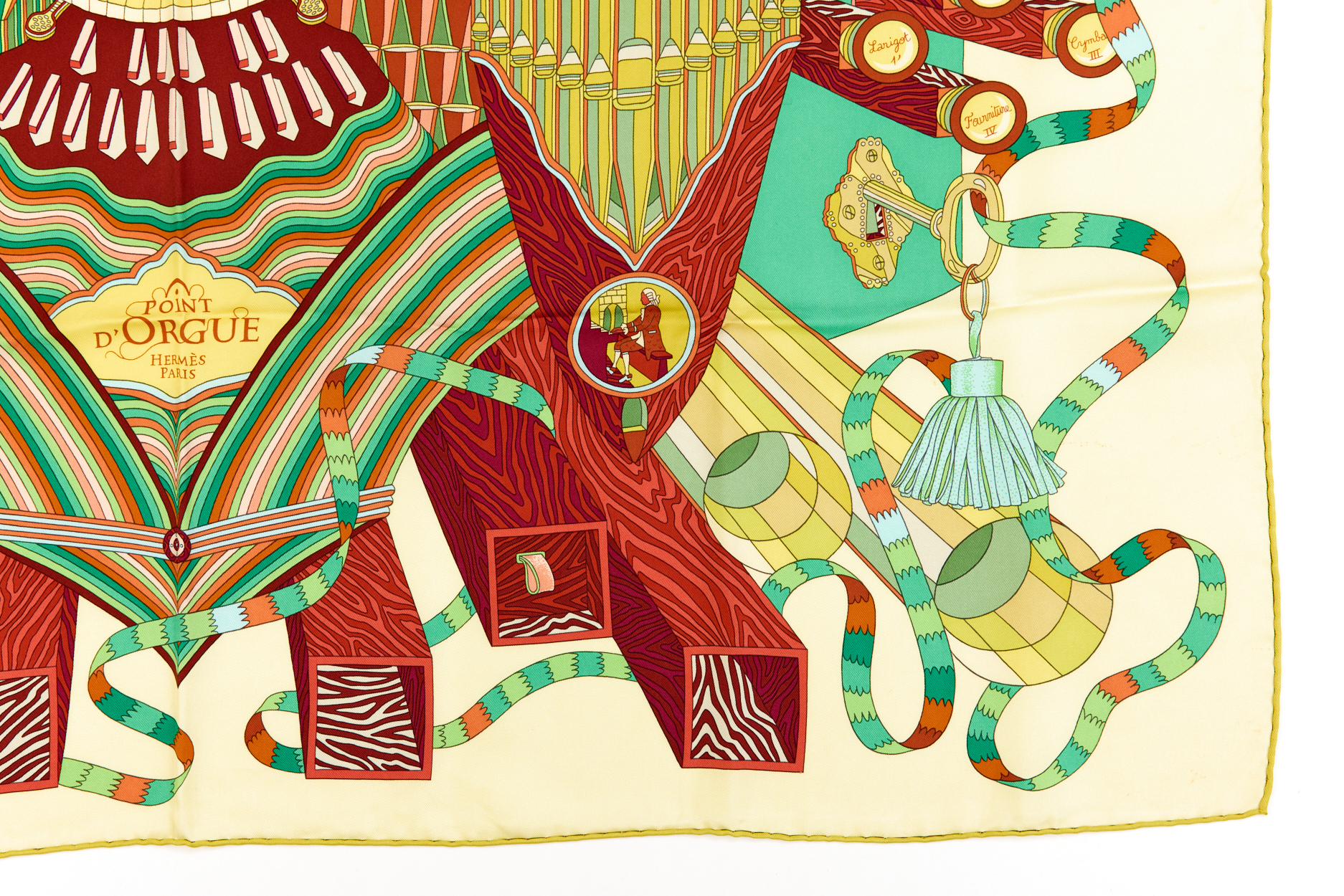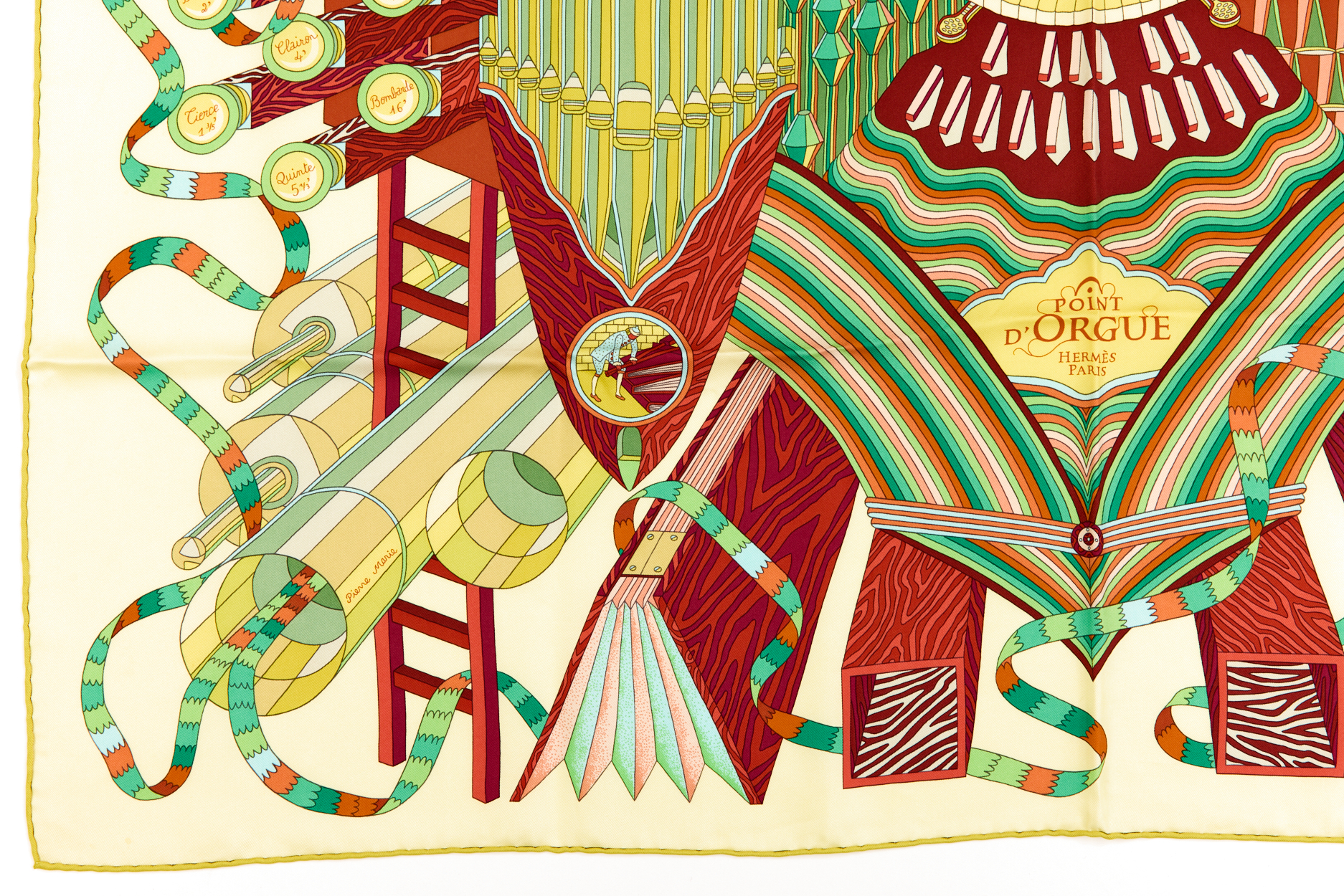 Hermes Silk Scarf Carre 90 “Point D’ORGUE” Yellow Silk Scarf Brand : HERMESDesign by – Issued –Item : ScarfSize : 88.5cm * 88.5cmMaterial : 100% SilkCondition Score: B+*For reference. The condition shown in the image takes precedence.*Please see the last two photos to see if the tag is still attached