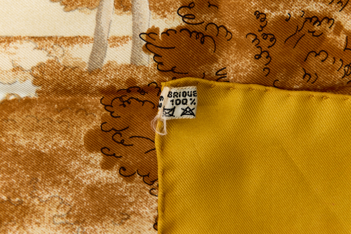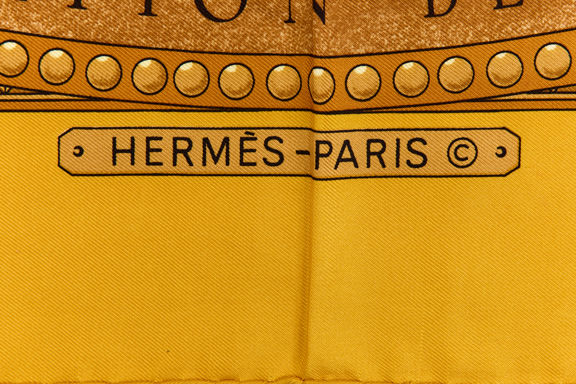 Hermes Silk Scarf Carre 90 “PRESENTATION DE CHEVAVX” Yellow Silk Scarf Brand : HERMESDesign by Philippe Ledoux Issued 1970Item : ScarfSize : 88.5cm * 88.5cmMaterial : 100% SilkCondition Score: B+*For reference. The condition shown in the image takes precedence.*Please see the last two photos to see if the tag is still attached