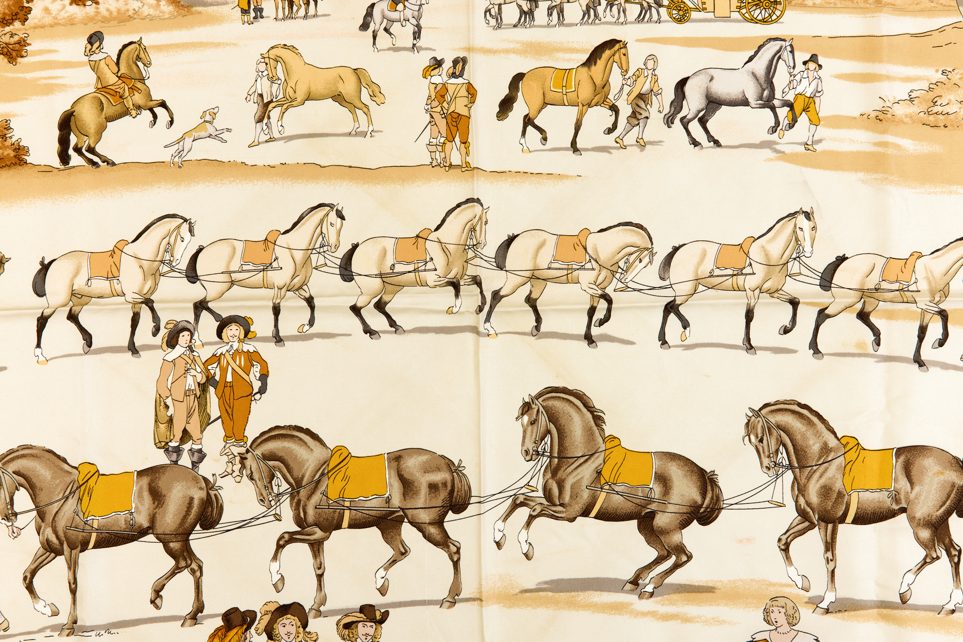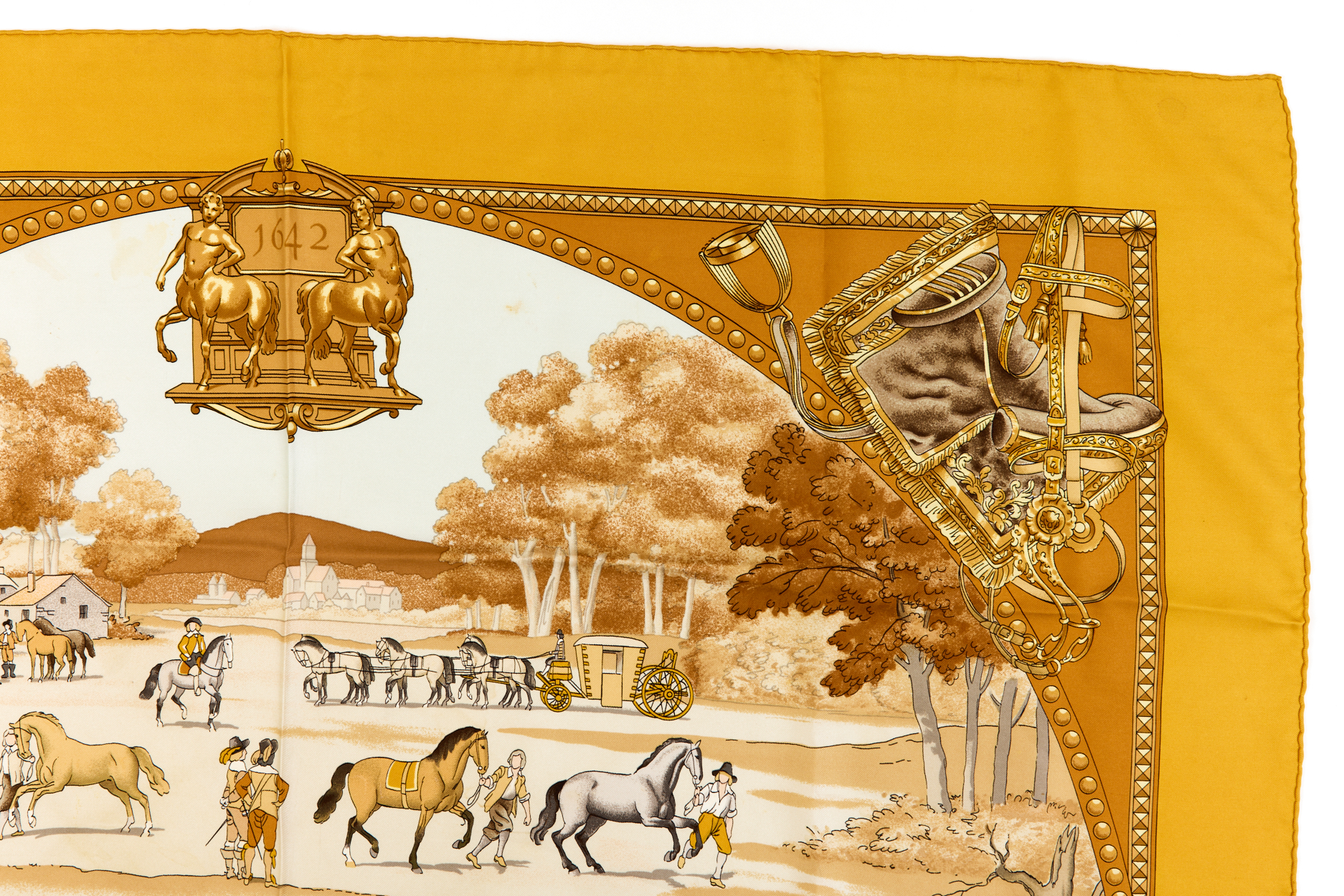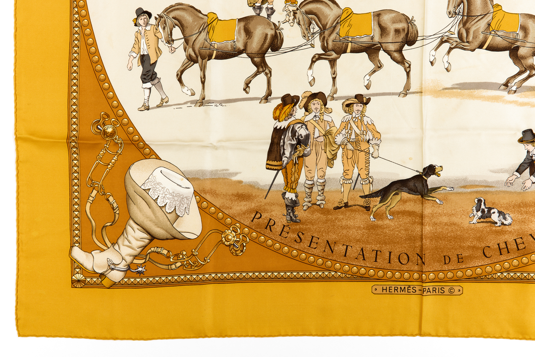 Hermes Silk Scarf Carre 90 “PRESENTATION DE CHEVAVX” Yellow Silk Scarf