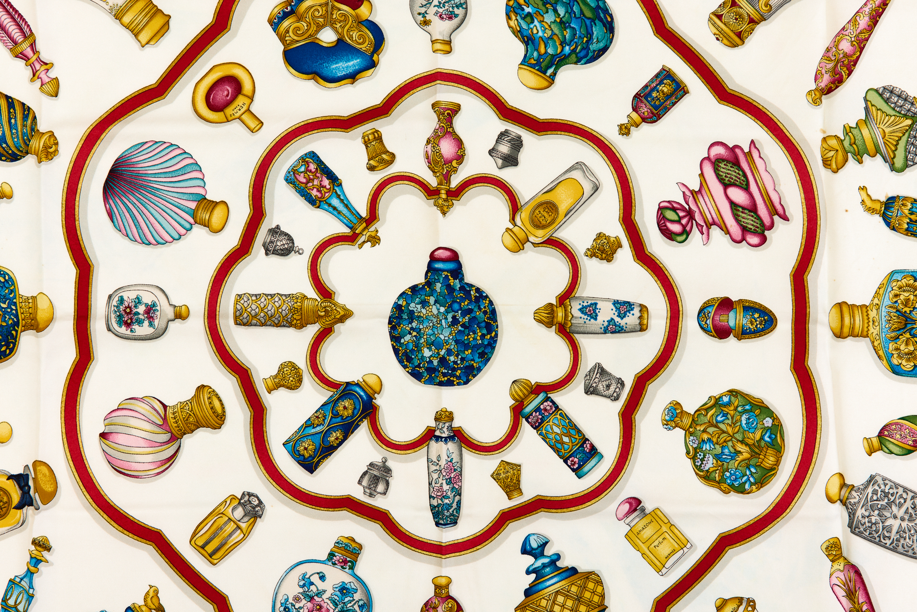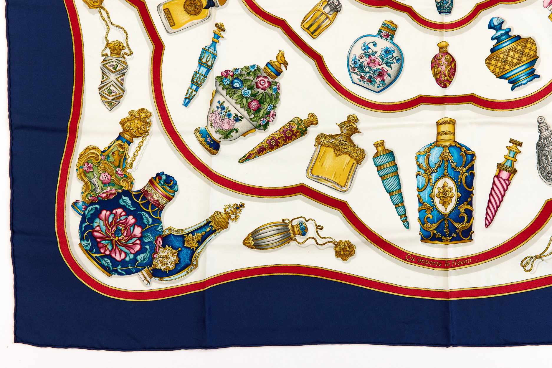 Hermes Silk Scarf Carre 90 “Qu’Importe Le Flacon” Blue Silk Scarf Brand : HERMESDesign by Catherine Baschet Issued 1988Item : ScarfSize : 88.5cm * 88.5cmMaterial : 100% SilkCondition Score: B+*For reference. The condition shown in the image takes precedence.*Please see the last two photos to see if the tag is still attached