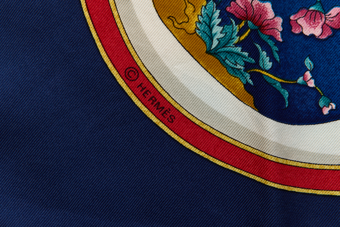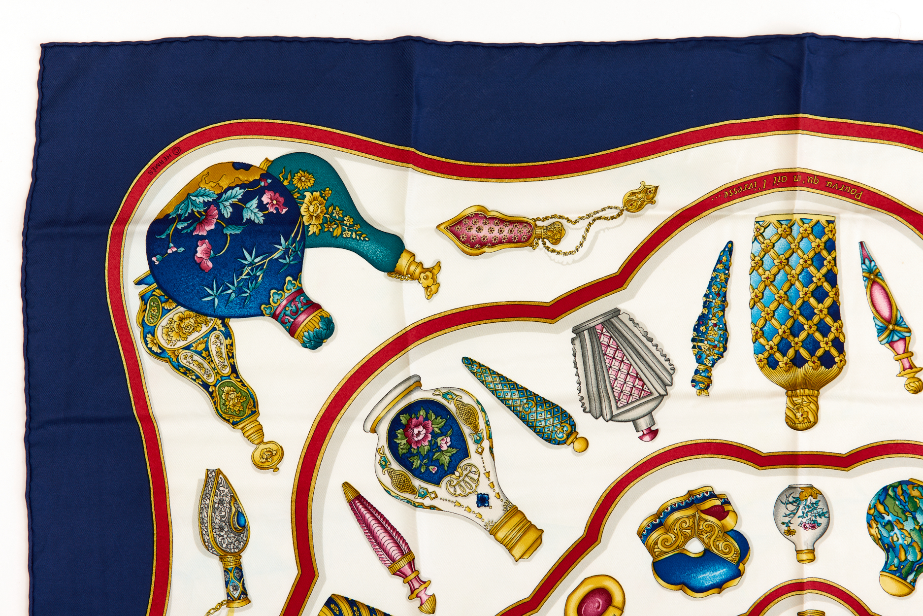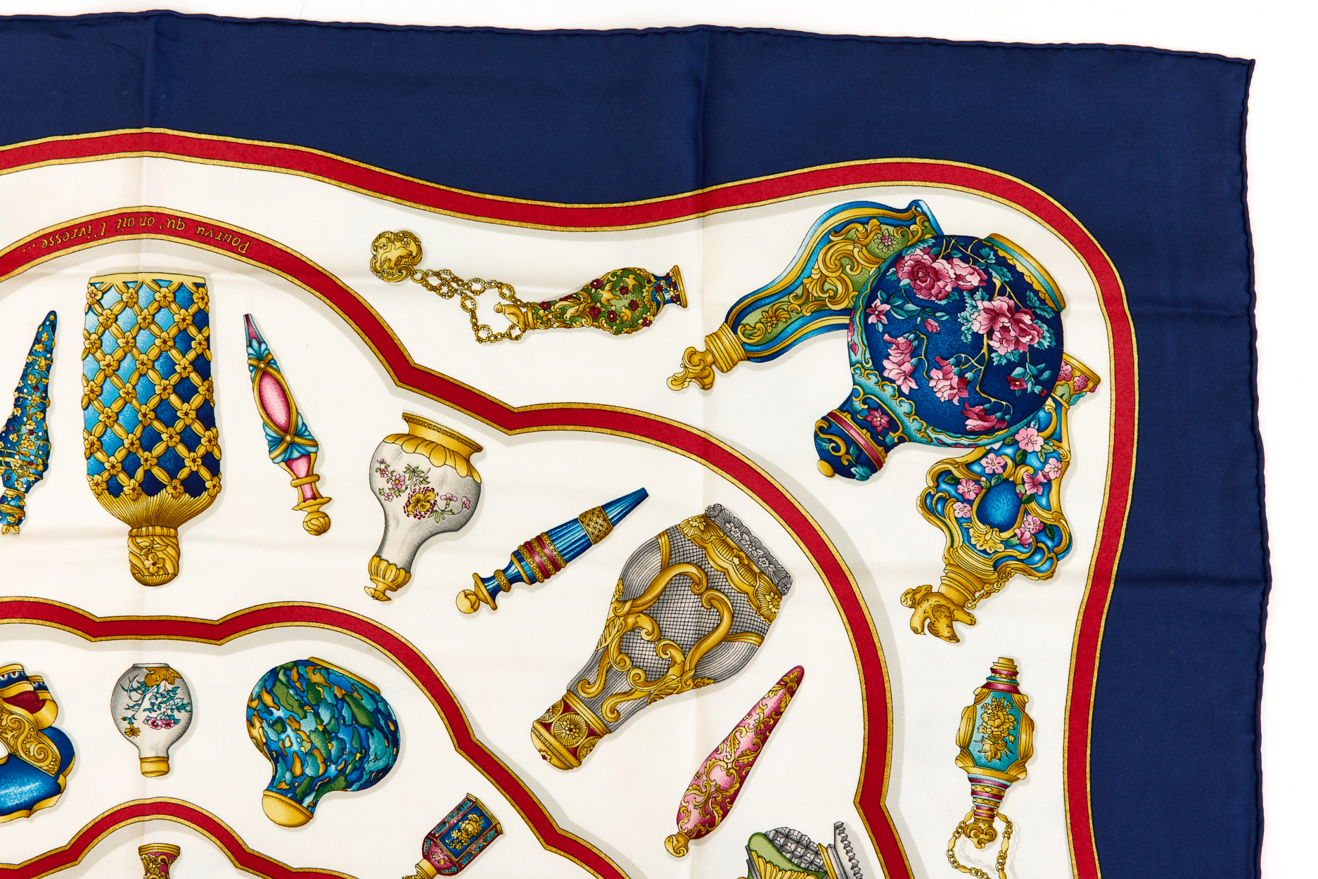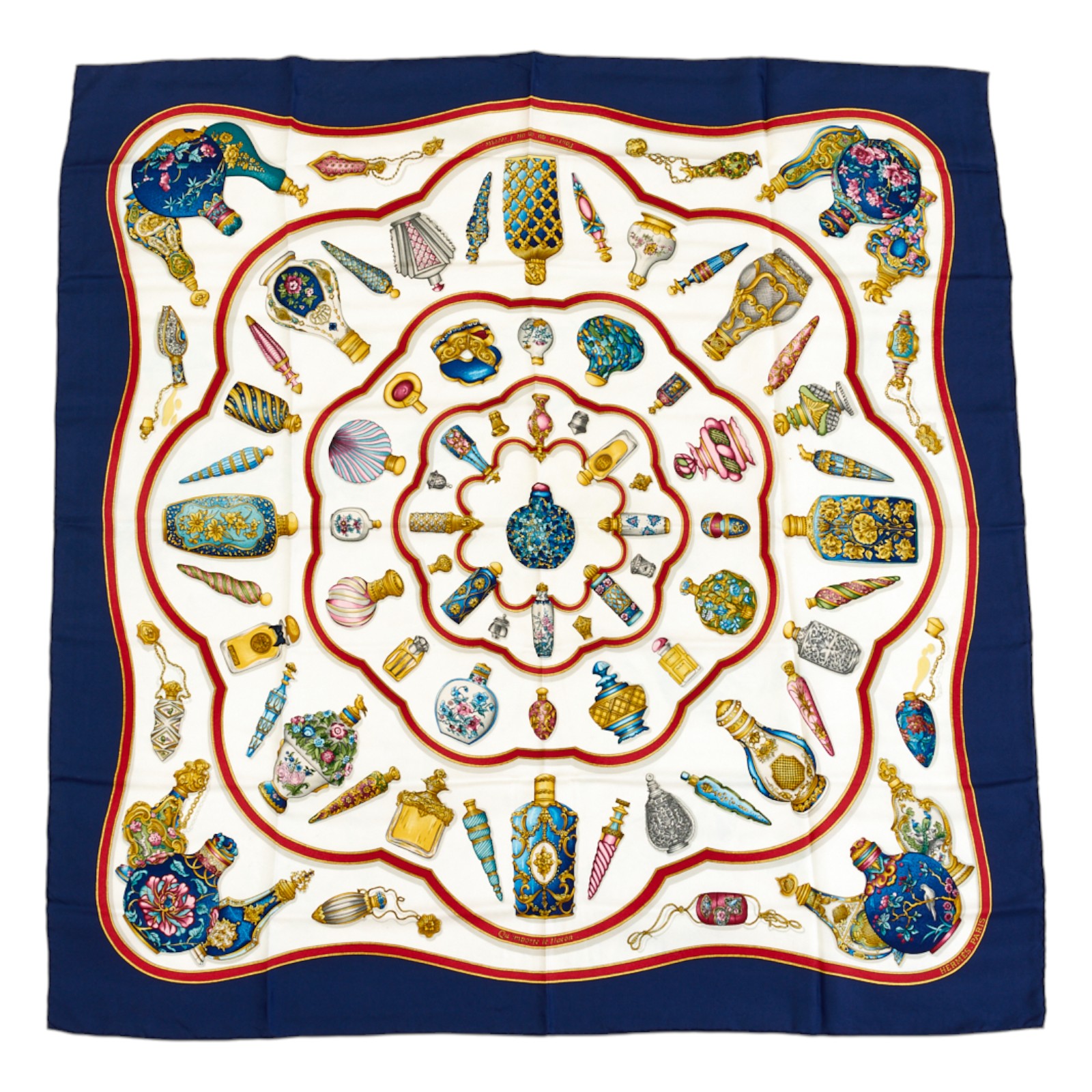 Hermes Silk Scarf Carre 90 “Qu’Importe Le Flacon” Blue Silk Scarf