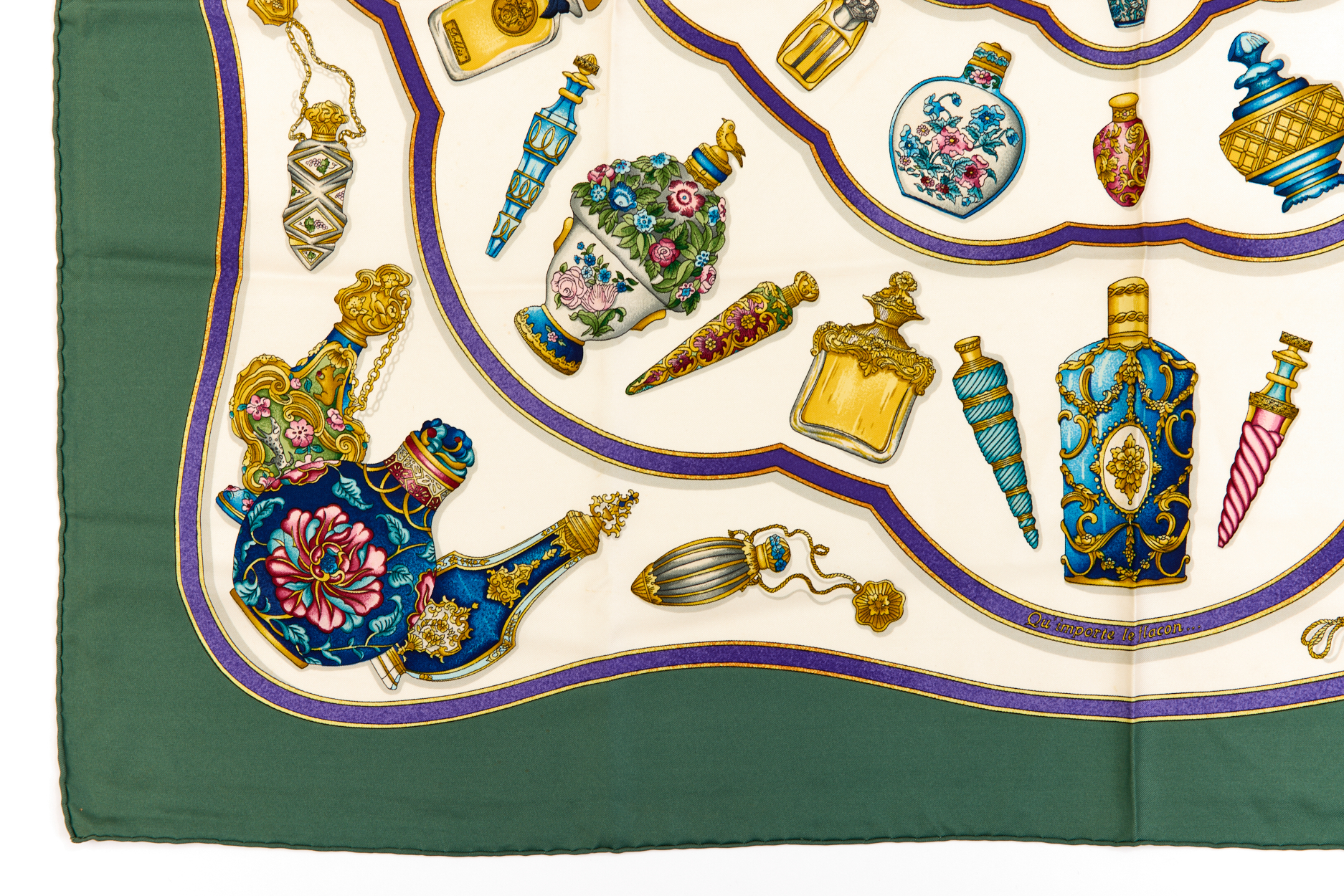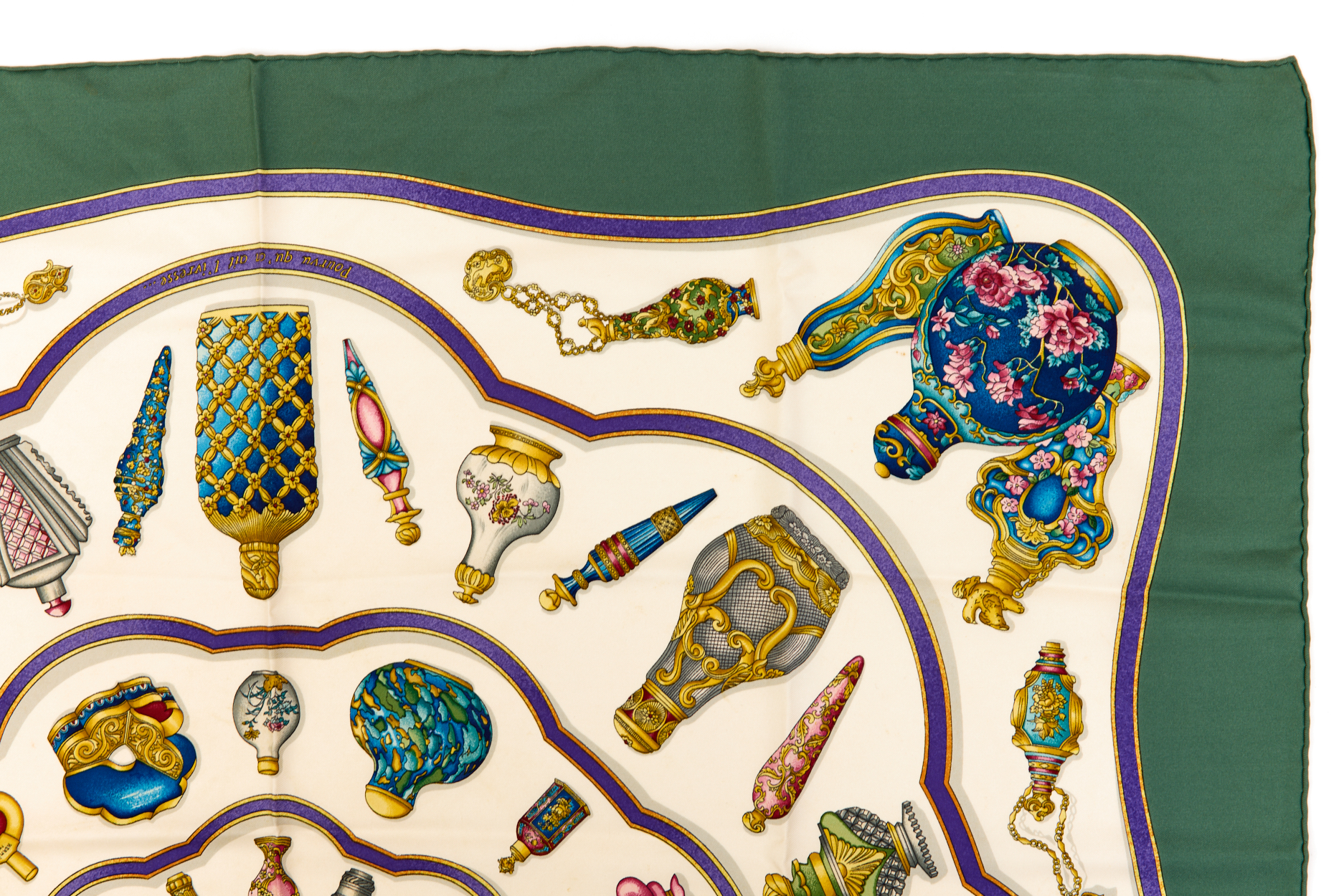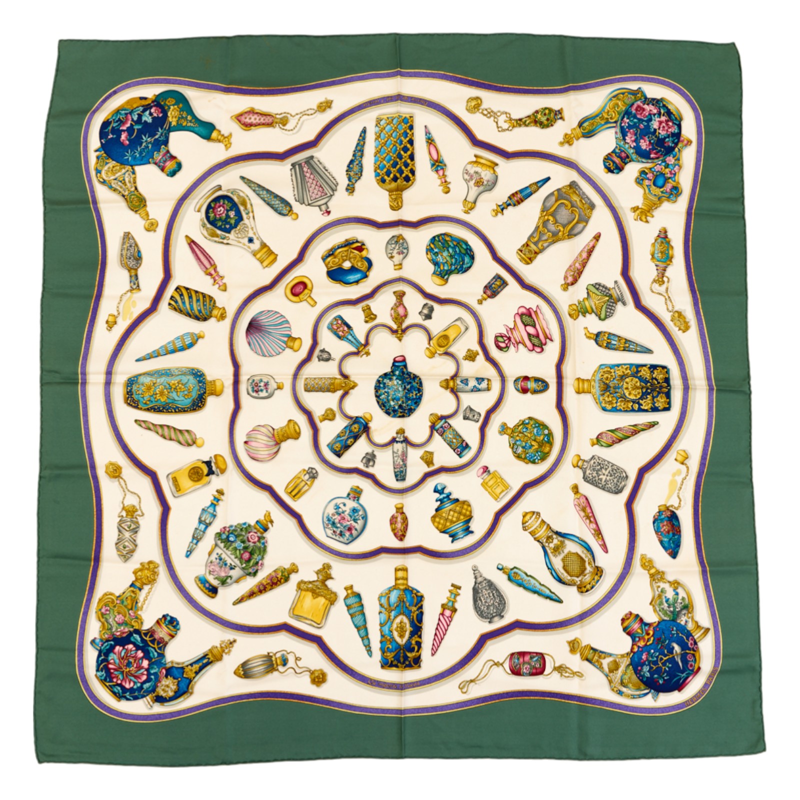 Hermes Silk Scarf Carre 90 “Qu’Importe Le Flacon” Green Silk Scarf