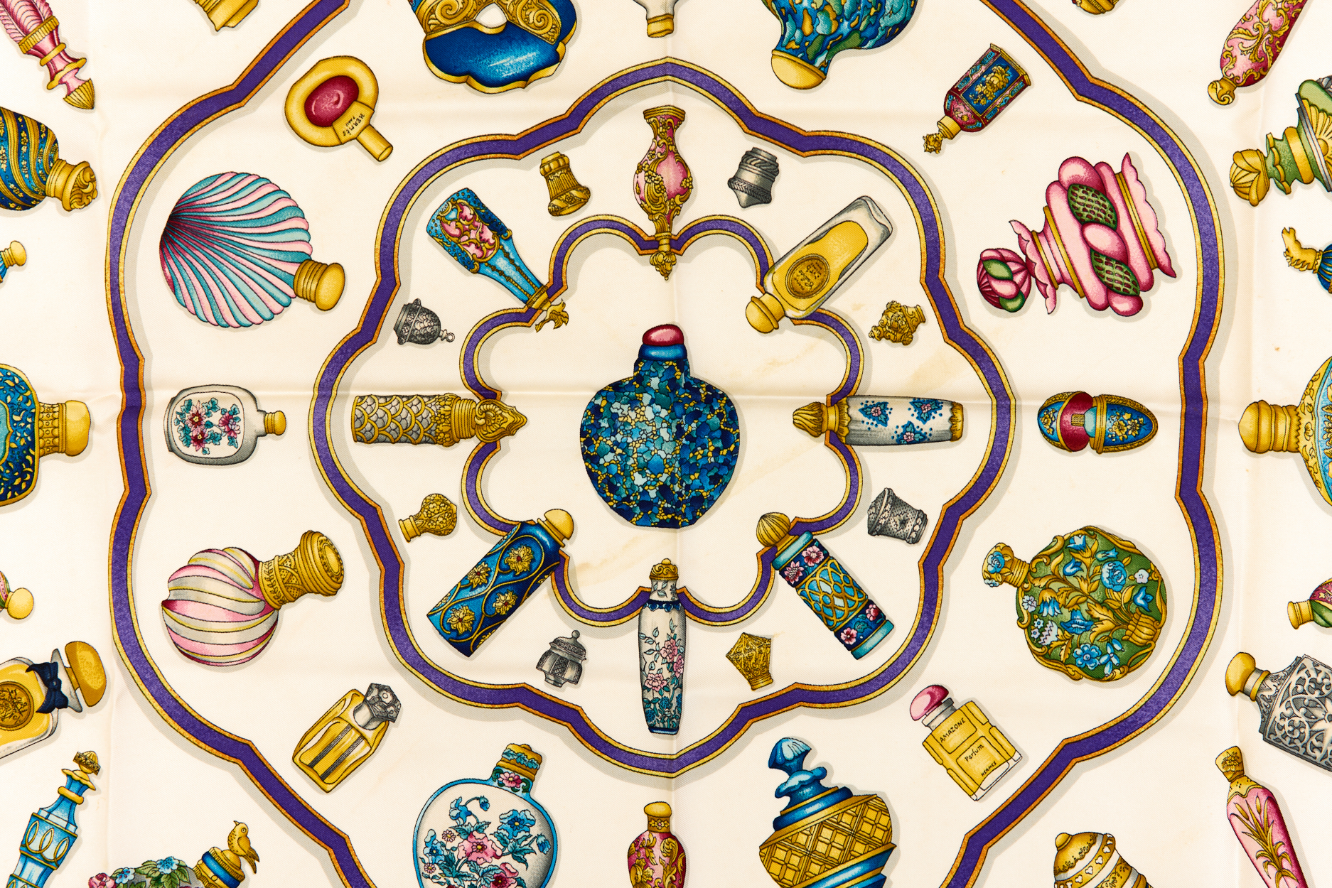 Hermes Silk Scarf Carre 90 “Qu’Importe Le Flacon” Green Silk Scarf Brand : HERMESDesign by Catherine Baschet Issued 1988Item : ScarfSize : 88.5cm * 88.5cmMaterial : 100% SilkCondition Score: B-*For reference. The condition shown in the image takes precedence.*Please see the last two photos to see if the tag is still attached