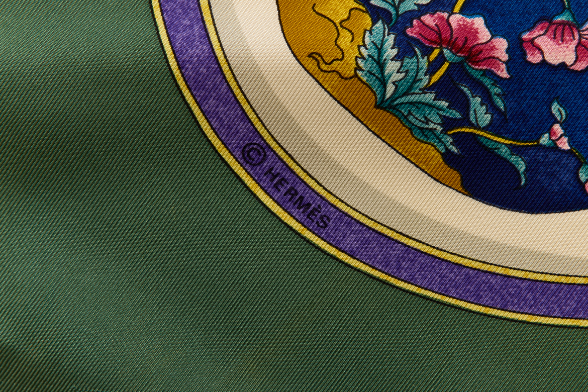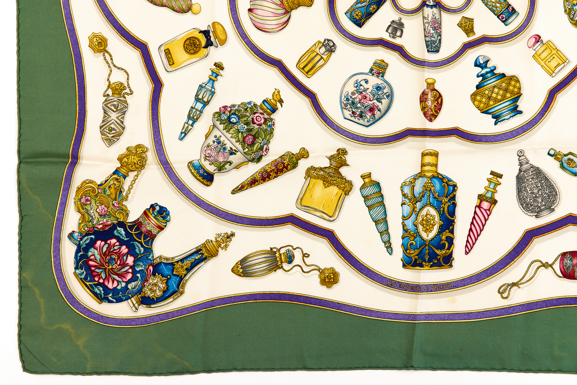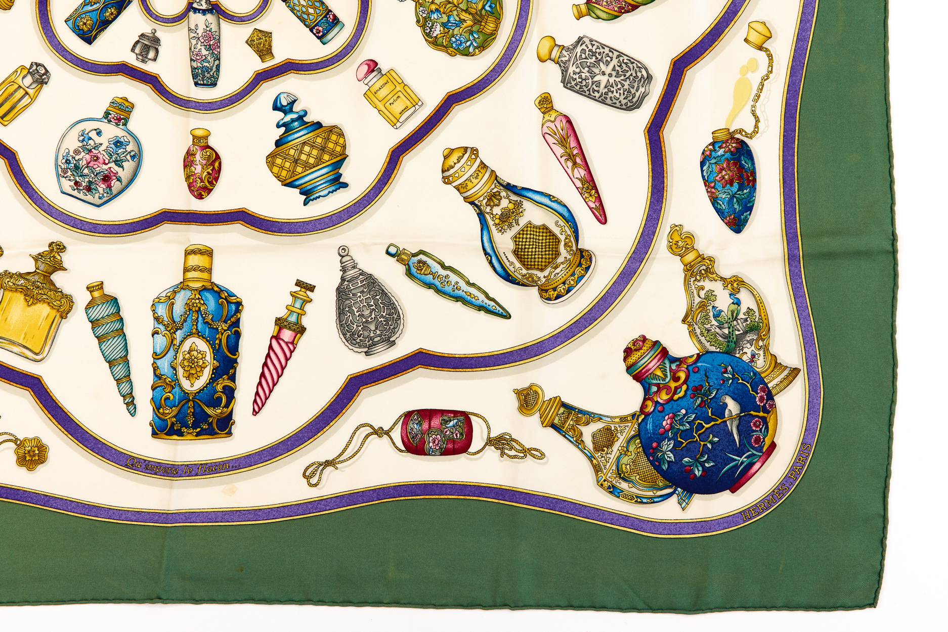 Hermes Silk Scarf Carre 90 “Qu’Importe Le Flacon” Green Silk Scarf