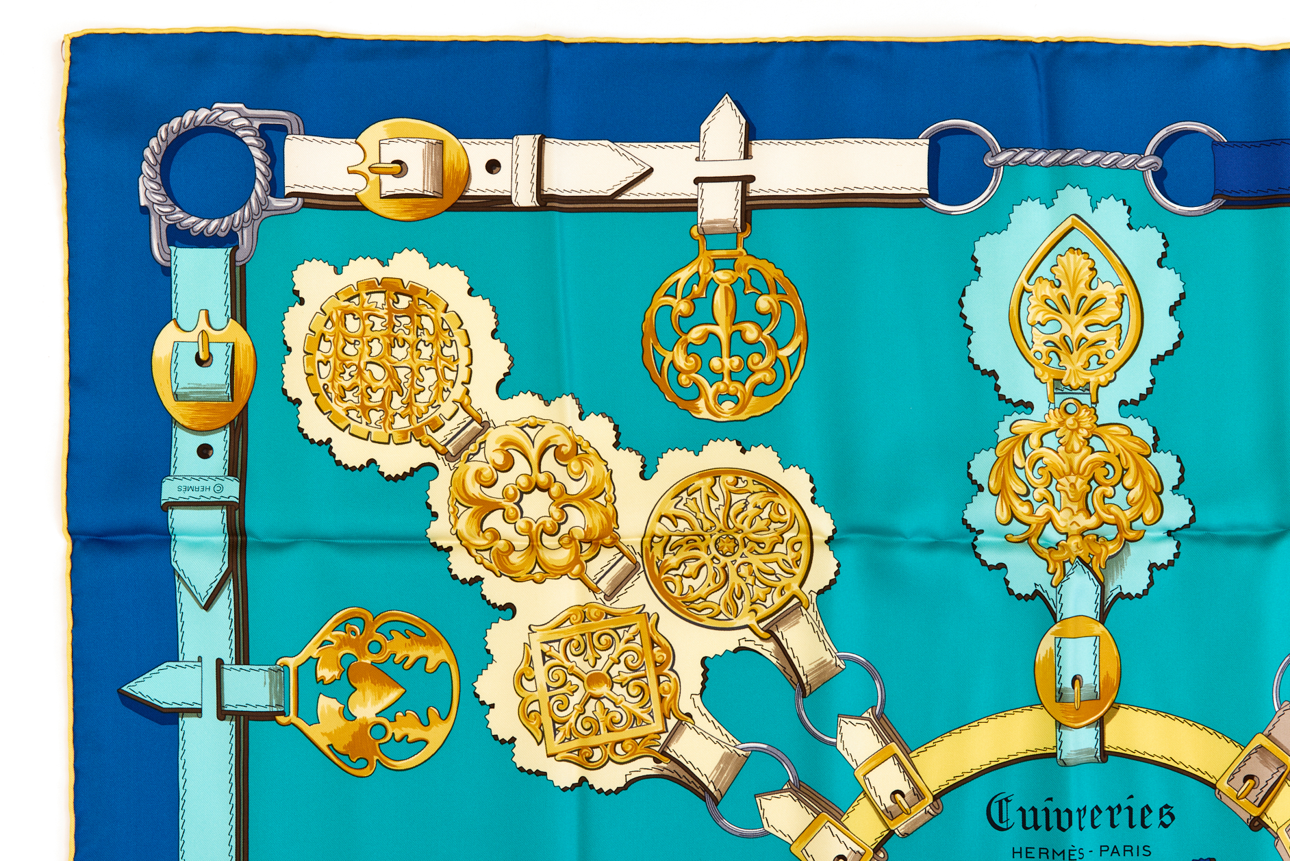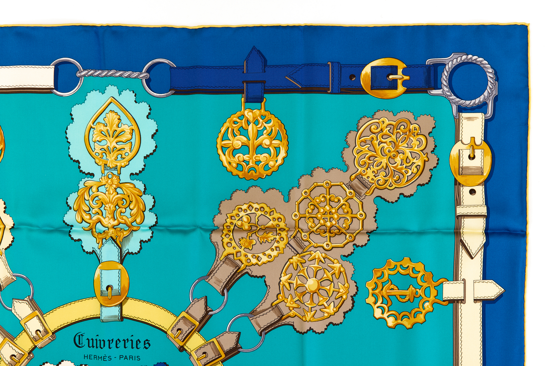 Rare! Hermes Silk Scarf Carre 90 “Cuivreries” Blue Silk Scarf Brand : HERMESDesign by Franoise De La Perriere Issued 1963Item : ScarfSize : 88.5cm * 88.5cmMaterial : 100% SilkCondition Score: A*For reference. The condition shown in the image takes precedence.*Please see the last two photos to see if the tag is still attached