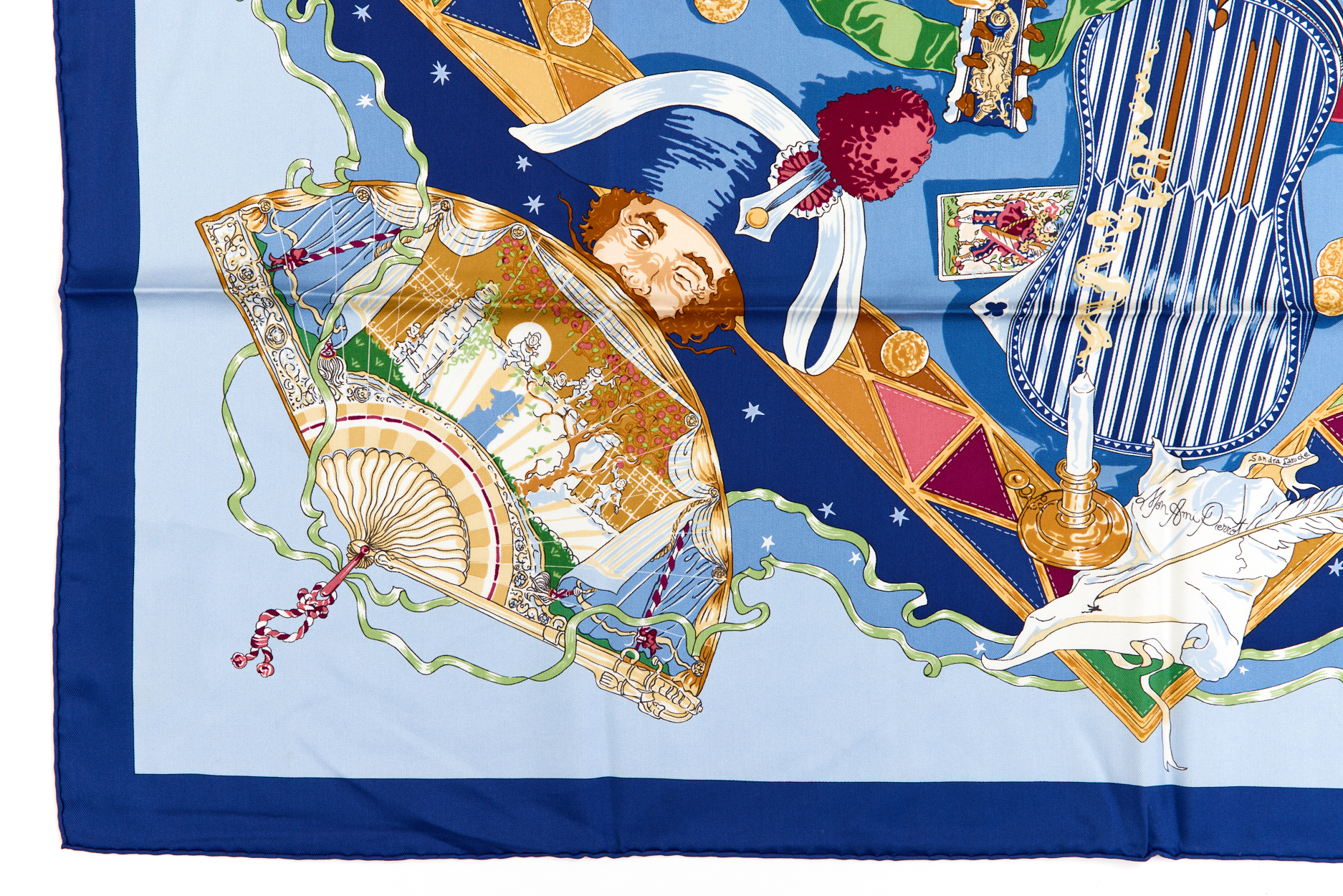 Hermes Silk Scarf Carre 90 “Mon Ami Pierrot” Blue Silk Scarf Brand : HERMESDesign by Sandra Laroche Issued 2003Item : ScarfSize : 88.5cm * 88.5cmMaterial : 100% SilkCondition Score: A*For reference. The condition shown in the image takes precedence.*Please see the last two photos to see if the tag is still attached